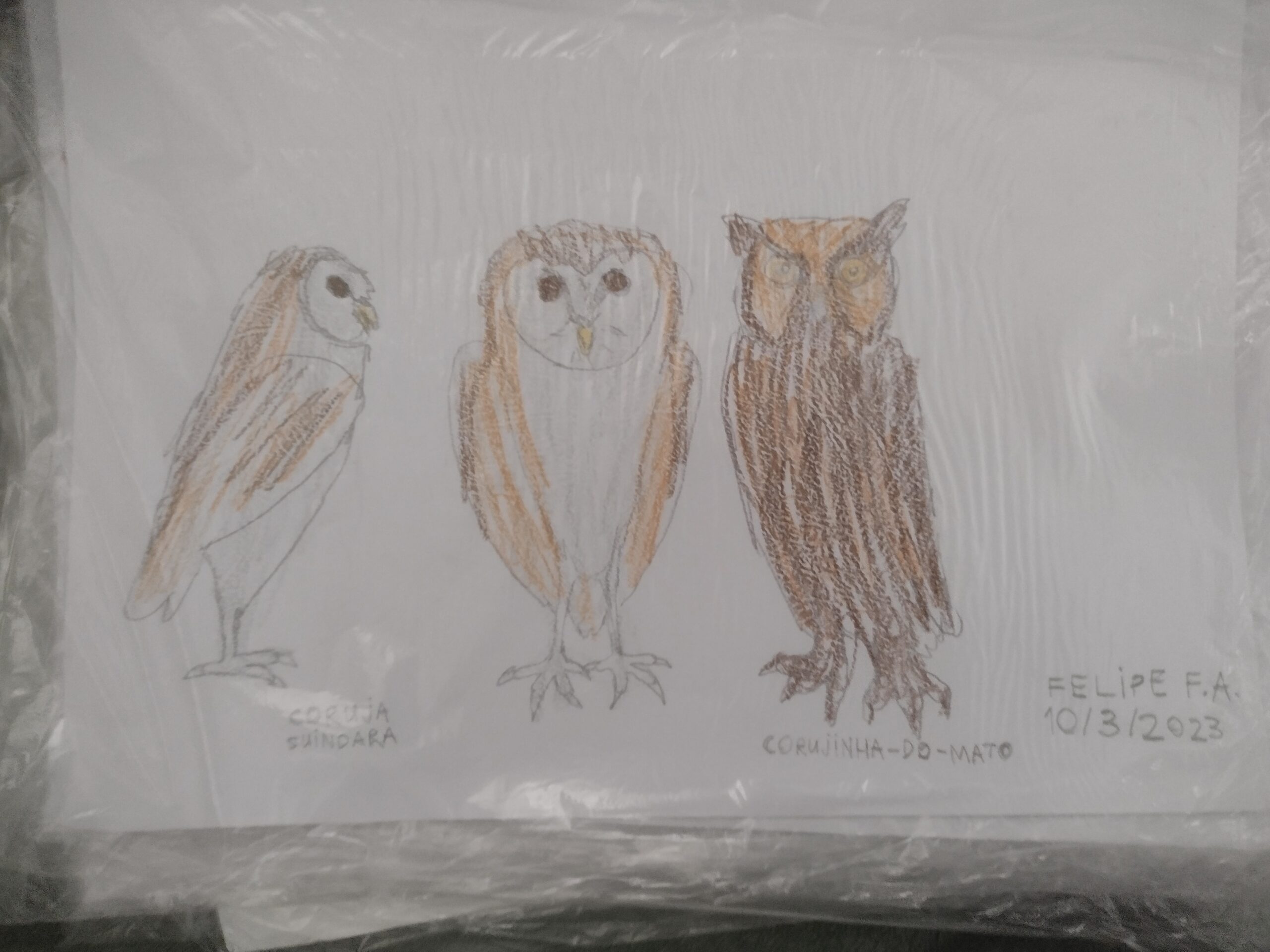 Essas corujas parecem feias. Desenho feito com papel grosso sem moldura. Para quem não me conhece, eu sou Felipe. Contatos:969221367/975337277/958928527.Obrigado.